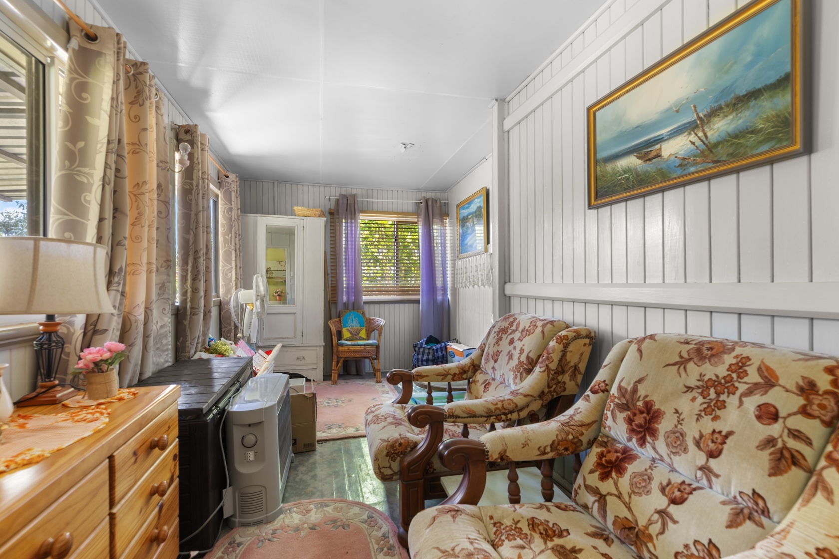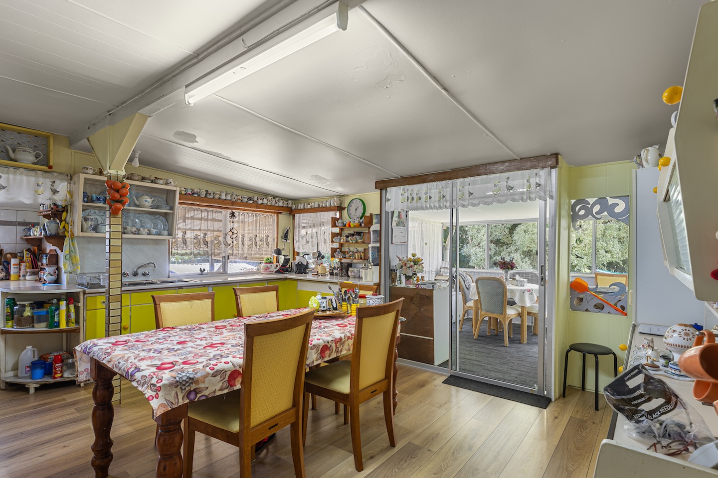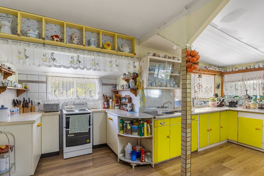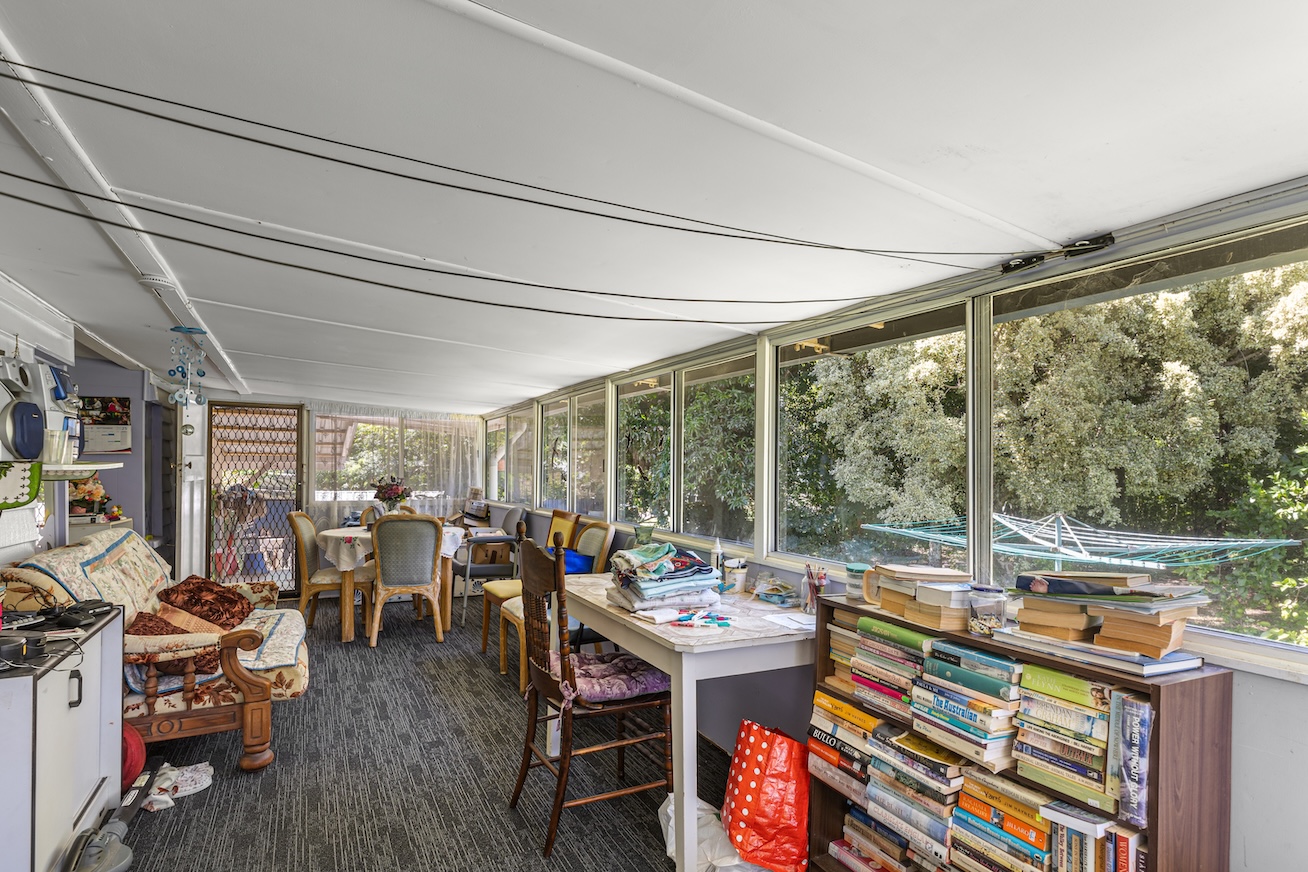 A central living room creates space for both quiet retreat and family connection. A sunroom adjoins the dining area and welcomes natural light, offering a gentle place for morning coffee or an afternoon read. The kitchen is generous in size and thoughtfully positioned to remain connected to daily life. A large internal laundry adds practicality, while VJ wall panelling brings texture and a subtle reminder of the home’s history.