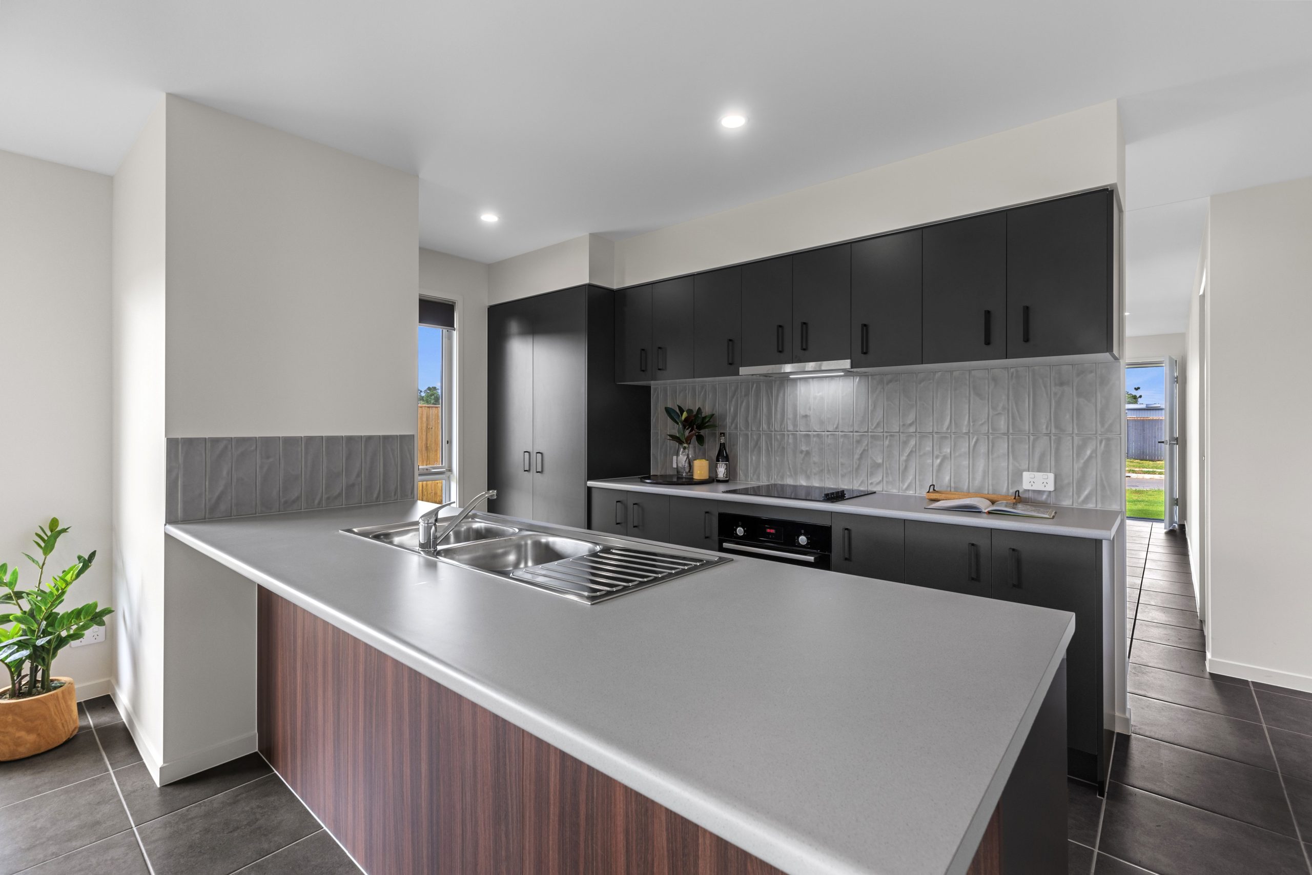 • Stylish modern kitchen with contour tiled backsplash, sleek matte black cupboards for storage tying in to the living area decor