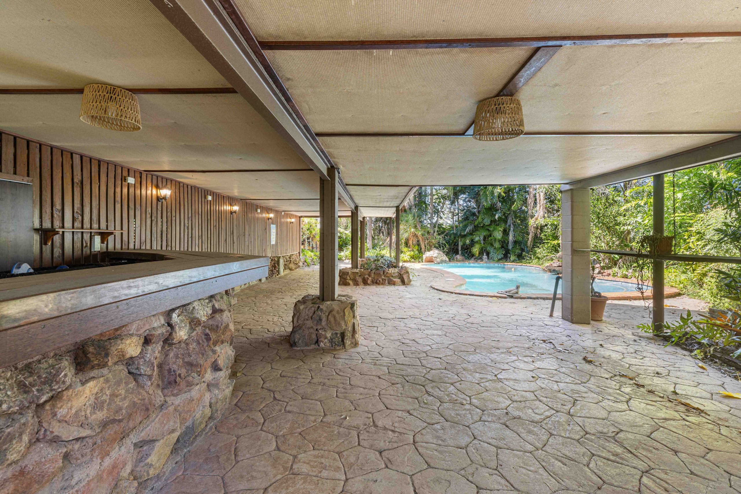 - Entertaining area by pool includes a large undercover area with rock bar